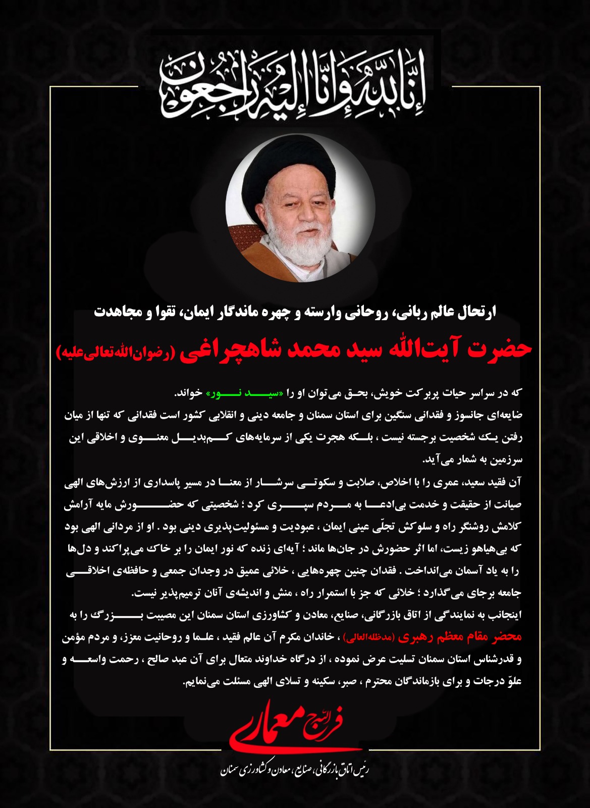 🔳اینجانب ، به نمایندگی از اتاق بازرگانی، صنایع، معادن و کشاورزی استان سمنان، این مصیبت بزرگ را به محضر مقام معظم رهبری (مدظلهالعالی)، خاندان مکرم آن عالم ربانی، علما و روحانیت معزز، و مردم مؤمن، صبور و قدرشناس استان سمنان صمیمانه تسلیت عرض مینمایم.